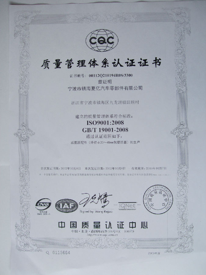 夏億公司于2012年10月8日通過(guò)ISO9001:2008認(rèn)證,于2013年9月18日通過(guò)ISO復(fù)審。